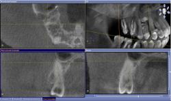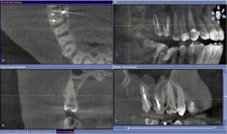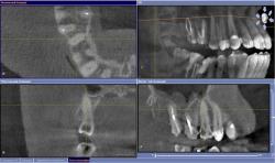 • На основании 3D исследования, выявившего апроксимальные кариозные полости, затрагивающие пульпарную камеру, и на дистальной и на медиальной поверхностях 1.5 зуба, планируется эндодонтическое лечение.
