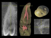 | Рис. 57-58 Горизонтальный срез через устьевую часть 1.5 зуба; выделенные фрагменты и 3-D визуализация (3-D Interactive Tooth ATLAS): щелевидный профиль корневого канала |